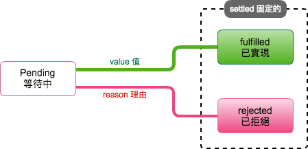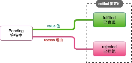 settled(固定的) ,指的是一個 promise 最後的狀態,也就是 fulfilled(已實現) 或 rejected(已拒絕) 其中一種。註: