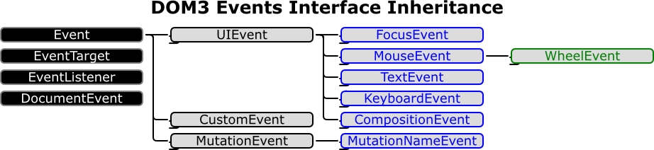 依照事件階層圖中,UIEvent與CustomEvent(自訂事件)繼承自Event物件,從UIEvent中又擴充出各種不同的對應事件,例如針對滑鼠與鍵盤的,FocusEvent是設計給Focus(鎖定、聚焦)事件使用的,CompositionEvent是針對輸入文字事件使用的,這是因為輸入文字並不一定單純使用鍵盤(用輸入法輸入或用語音輸入等等),它與鍵盤事件也可以相互輔助。而WheelEvent是有滾輪的設備使用的。