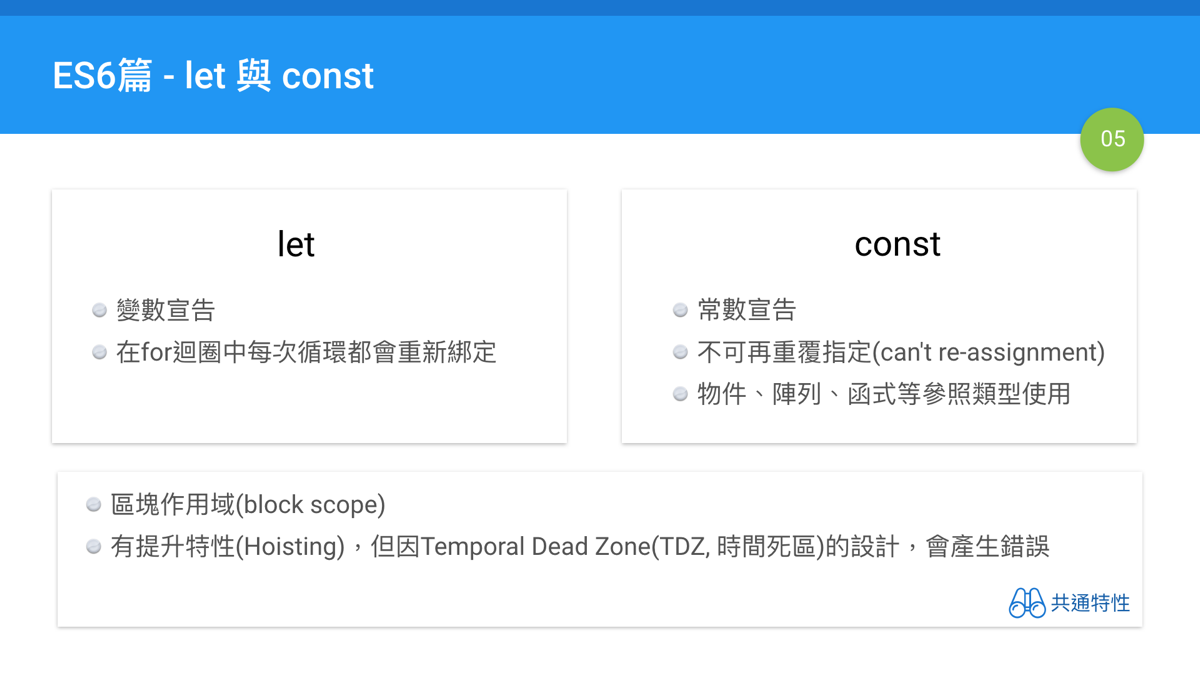 很快地進入到鐵人賽的第5天,也進入到ES6篇的章節之中。本章的目標是針對let與const這兩個用於宣告變數與常數的語句,作重點式的介紹。有很多是整理我個人從討論區的回答文章。
