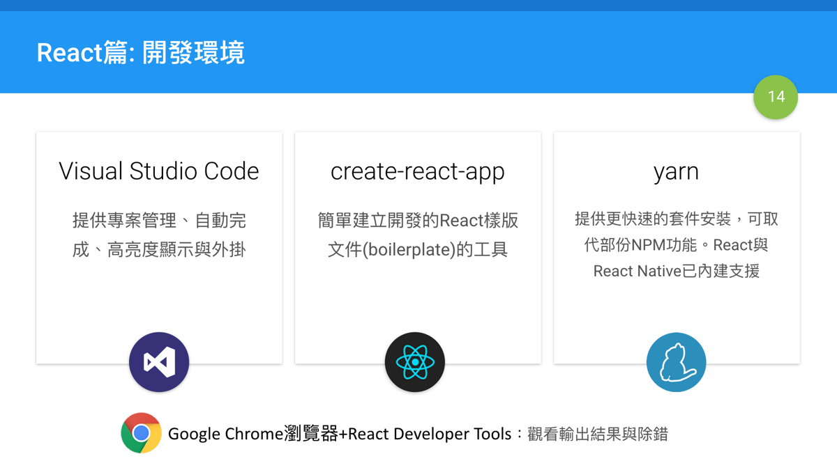 本文很快地介紹建置React使用的開發環境,對比之前的用於ES6學習的開發環境與工具,其實都是大同小異的設定方式,唯一的差異是多Facebook最近所發佈的yarn與create-react-app工具。這兩個工具因為最近才推出,所以有些功能還是很新,可能裡面的設定還會再變動,濳在的問題也滿多的。初學者在使用時,記得還是不要花太時間在作設定的部份,有時候你可能會遇上還沒解決的問題。