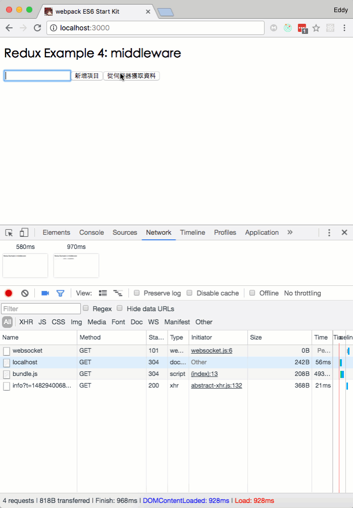 重點在於最後的action.cb(json, store.dispatch),可以讓對應的Action去呼叫另一個作為處理的Action,也就是INIT_ITEMS這個Action Creater寫法。