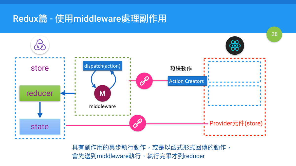 今天的主題是在Redux中處理副作用,我們要使用的是一個稱為middleware(中介軟體)的技巧來作,這在Redux裡就有內建這個設計了。以目前來說,middleware(中介軟體)是最簡單的一種解決在Redux中副作用問題的方式,也有很多這種middleware套件,不過在這個例子中並沒有使用像Redux作者開發的redux-thunk套件,我把它放在補充說明裡。